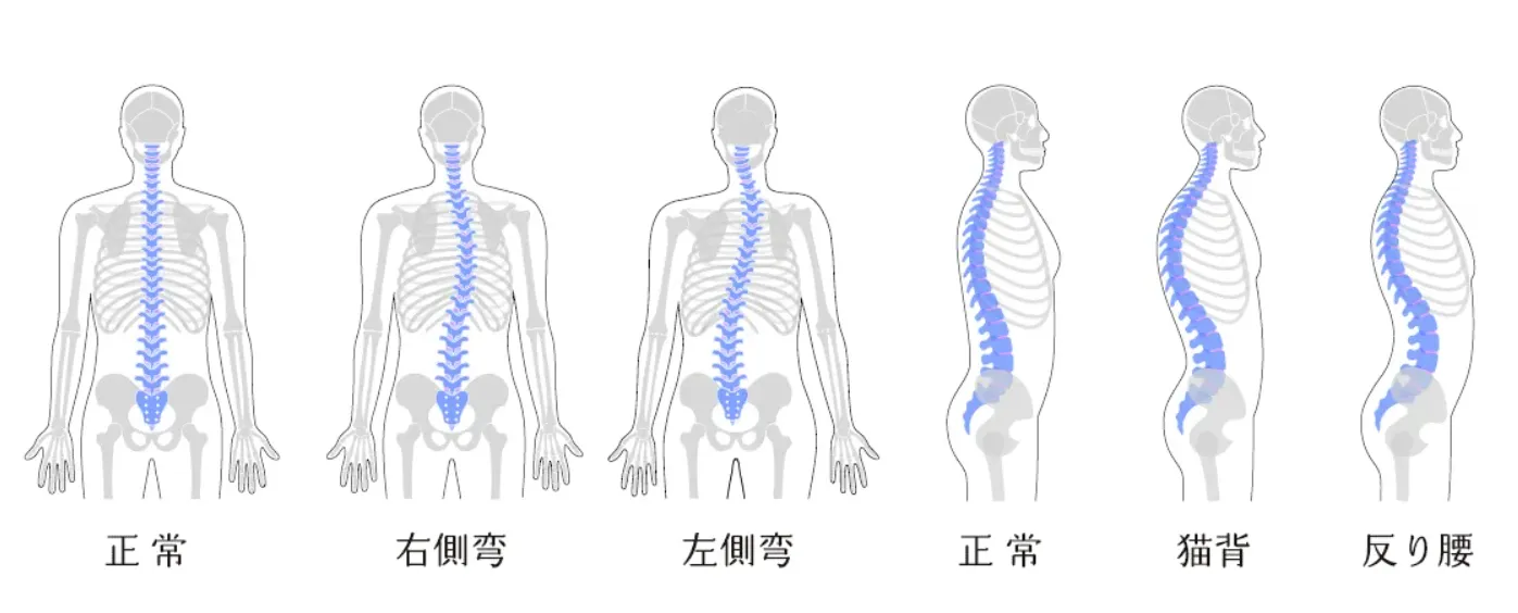 もし、正⾯もしくは背後から⾒て、⾮対称な部分があるとしたら、⾻盤や背⾻における左右の歪みが疑われます。